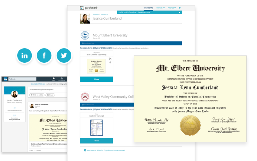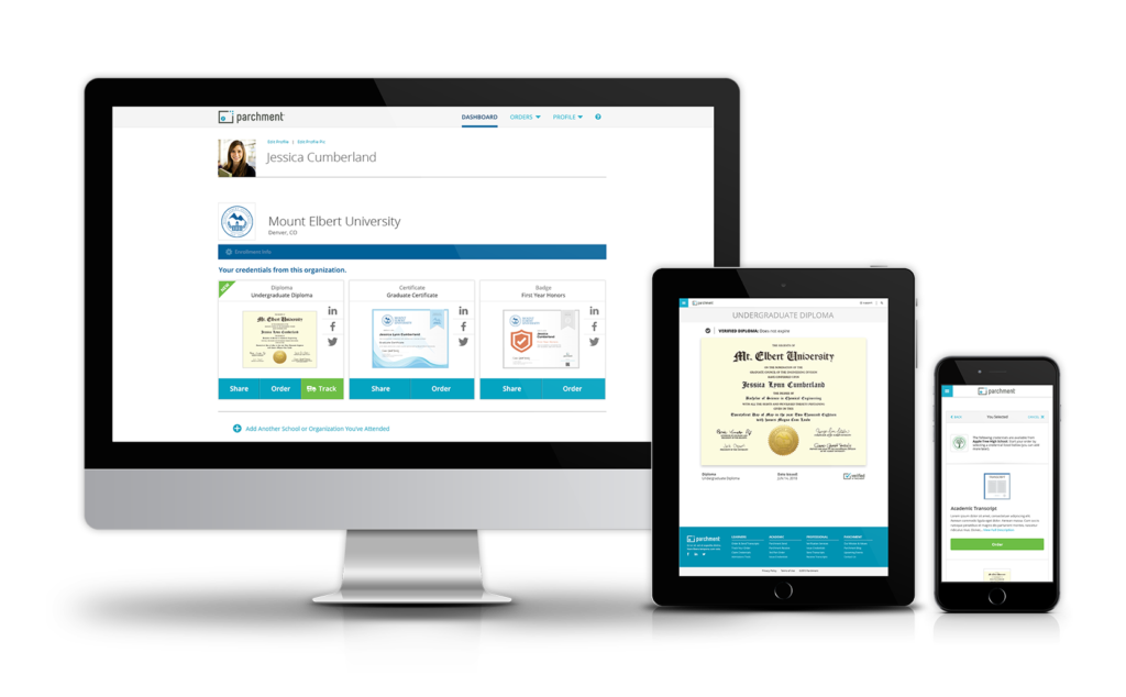 Your Parchment credential profile allows you to manage all of your hard-earned lifelong achievements in one place, accessible from any device at any time. Parchment follows you as you progress to your next step: high school, college, and professional development.